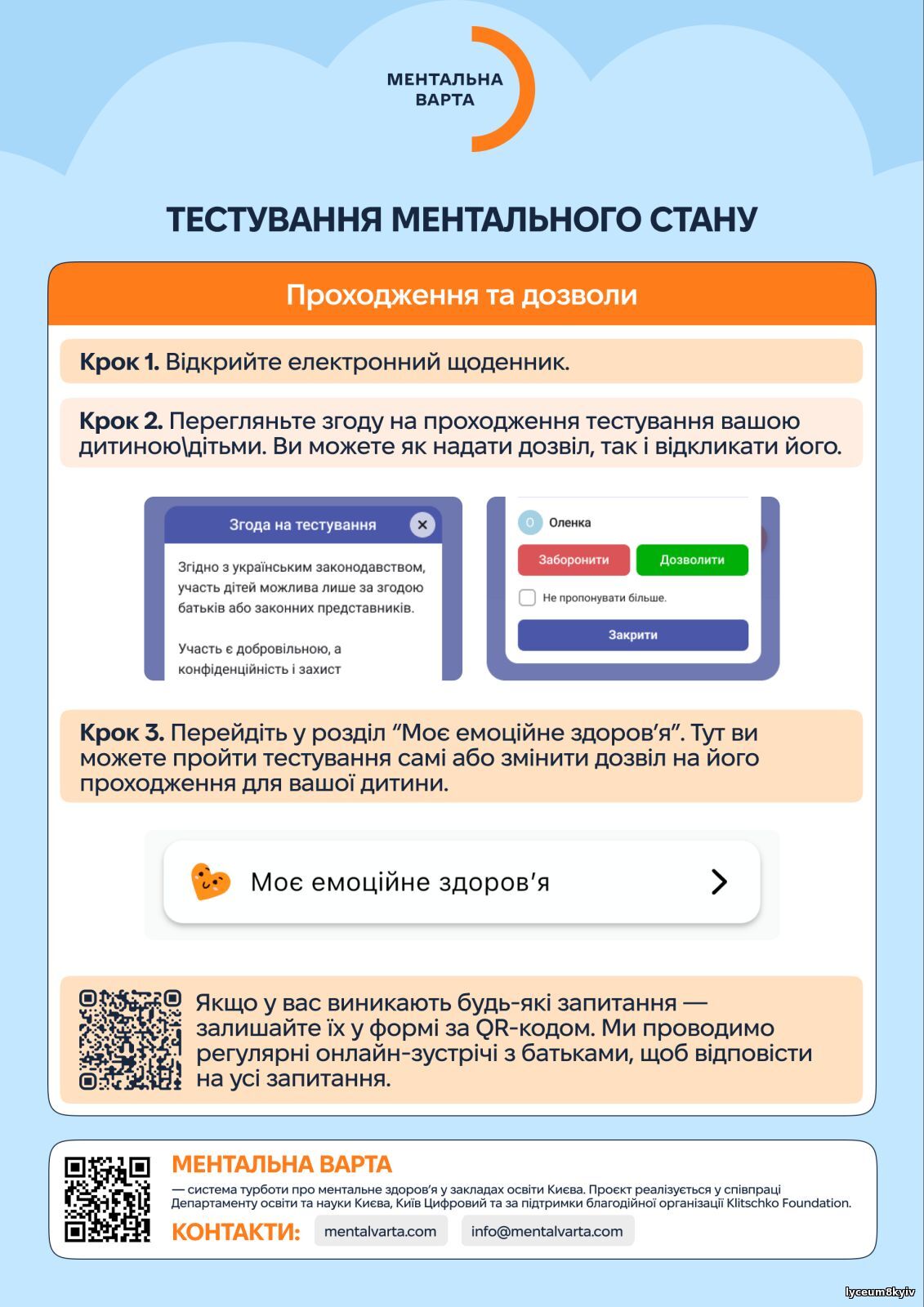 Важливо: до тестування залучаються лише учні від 14 років (включно) і участь можлива виключно за згодою батьків. Запит на згоду ви отримаєте в застосунку електронного щоденника. Тестування є добровільним, його можна пройти у зручний час, а результати формуються та відображаються одразу після завершення.