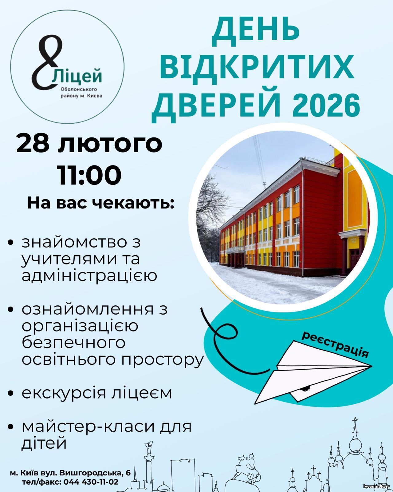 У вашій родині підростає майбутній першокласник? Тоді маємо для вас чудову новину! 🏫 Ліцей № 8 Оболонського району м. Києва запрошує жителів Пріорки та Куренівки на День відкритих дверей. Ми чесно й без прикрас розкажемо та покажемо: 🗓 28 лютого 2026 року Обіцяємо: буде цікаво, змістовно й без нудних «лекцій» 😉 👉 Обов’язкова реєстрація за посиланням: