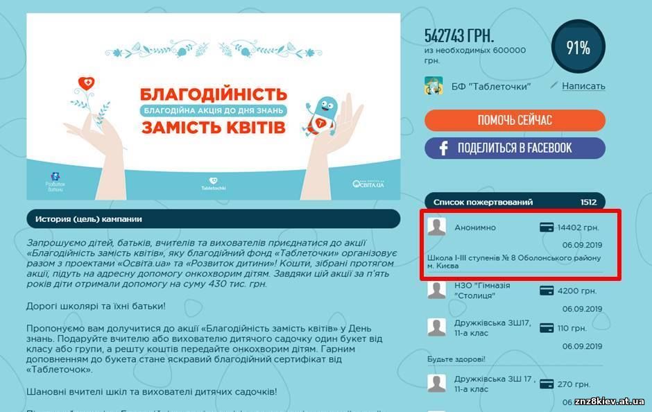 Школа І-ІІІ ступенів № 8 Оболонського району м. Києва взяла участь в акції БФ "Таблеточки" "Благодійність замість квітів". Дякуємо всім, хто долучився до доброї справи.